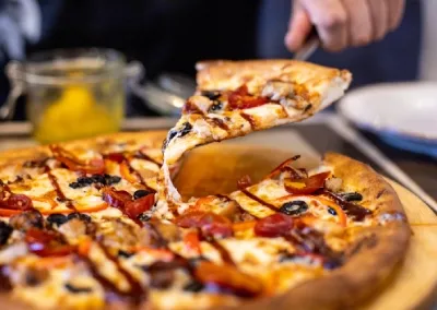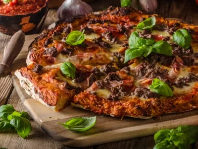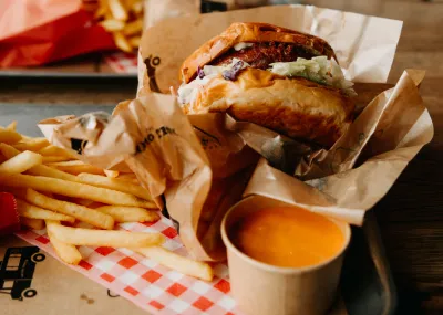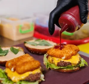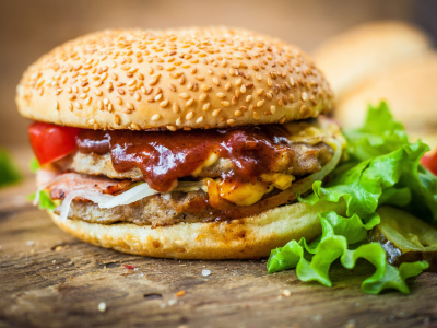 a popular food item consisting of a cooked, round, and flat patty—usually ground beef, but also chicken, pork, or plant-based alternatives—served inside a sliced bread roll or bun.